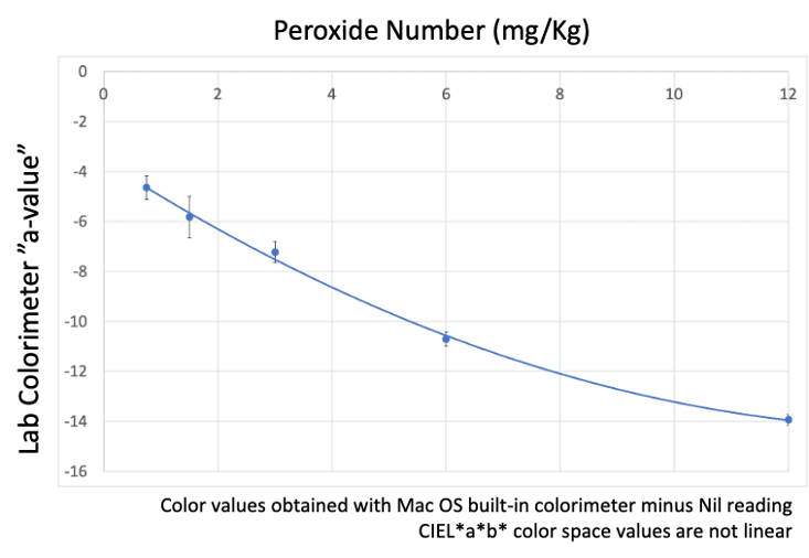 The VerraGlo Peroxide Number* Color Test for petrochemicals & renewable diesel can determined the Peroxide Number (mg/Kg) with only 3 drops of fuel, and comparison to a standard color chart (see image), or using a reflectance colorimeter. The color difference between PN 0.75 and 1.5 is easily discernible with a colorimeter (see lower plot).